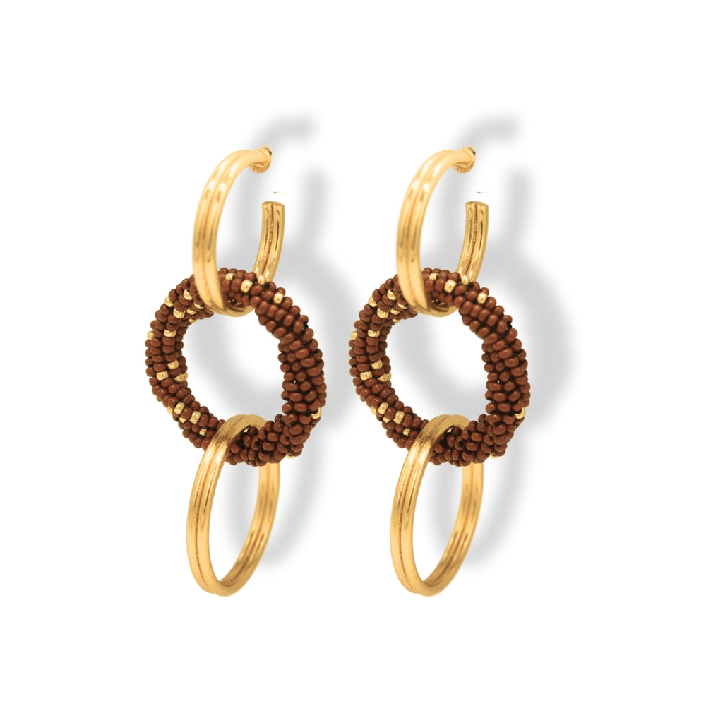 Candongas con 3 aros: uno tejido en cuentas de vidrio terracota y dos en bronce dorado. Diseño artesanal con volumen y textura. 💛