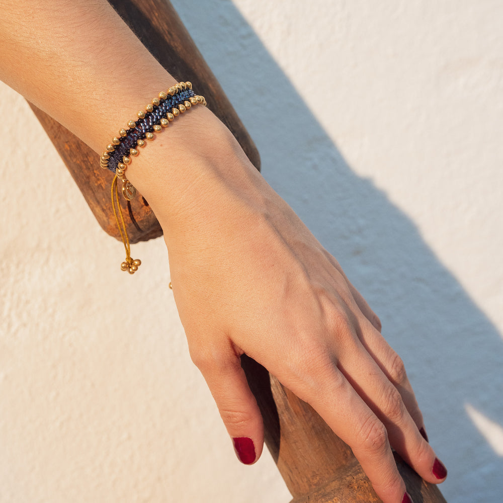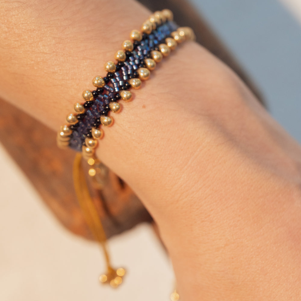 Esta pulsera Tierra Azul y dorada está tejida a mano con cristales de vidrio, ofreciendo un diseño único que combina elegancia y naturaleza. Su color azul es perfecto para cualquier estilo y su ajuste flexible se adapta cómodamente a todas las muñecas. Al comprarla, apoyas directamente a artesanos locales que mantienen vivas tradiciones de trabajo manual, promoviendo un comercio justo y responsable. Ideal para quienes buscan un accesorio exclusivo y con propósito.