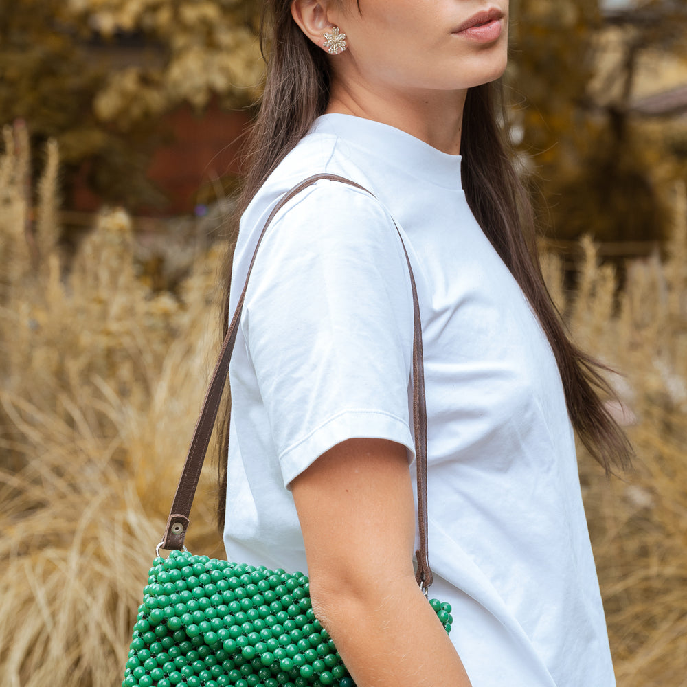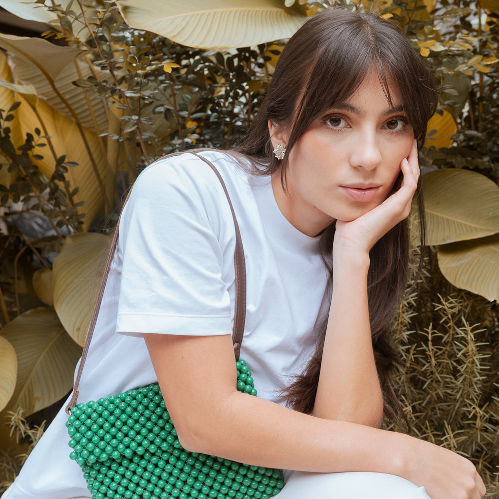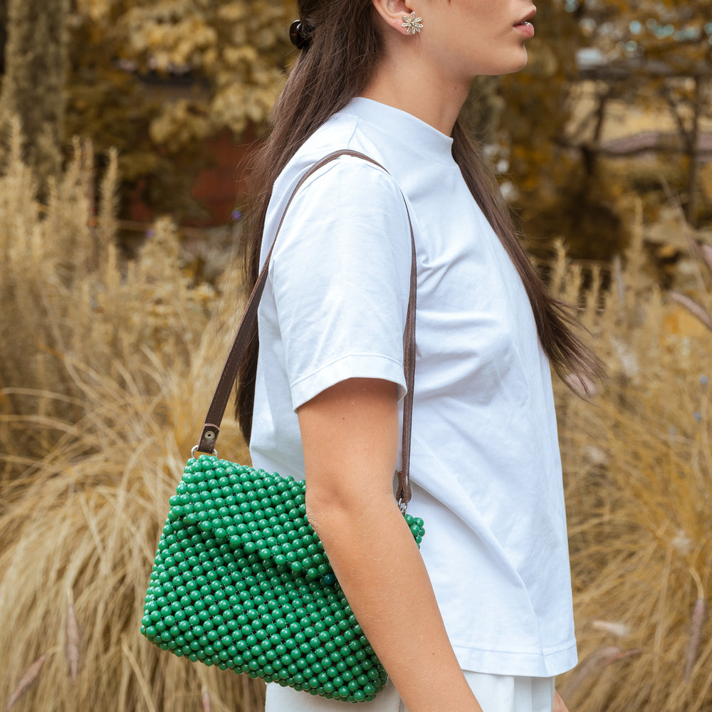 Este bolso está tejido a mano con cuentas de acrílico verde, creando una textura única y llena de carácter. Cada pieza es elaborada cuidadosamente por artesanas colombianas, lo que lo convierte en un accesorio auténtico y especial.