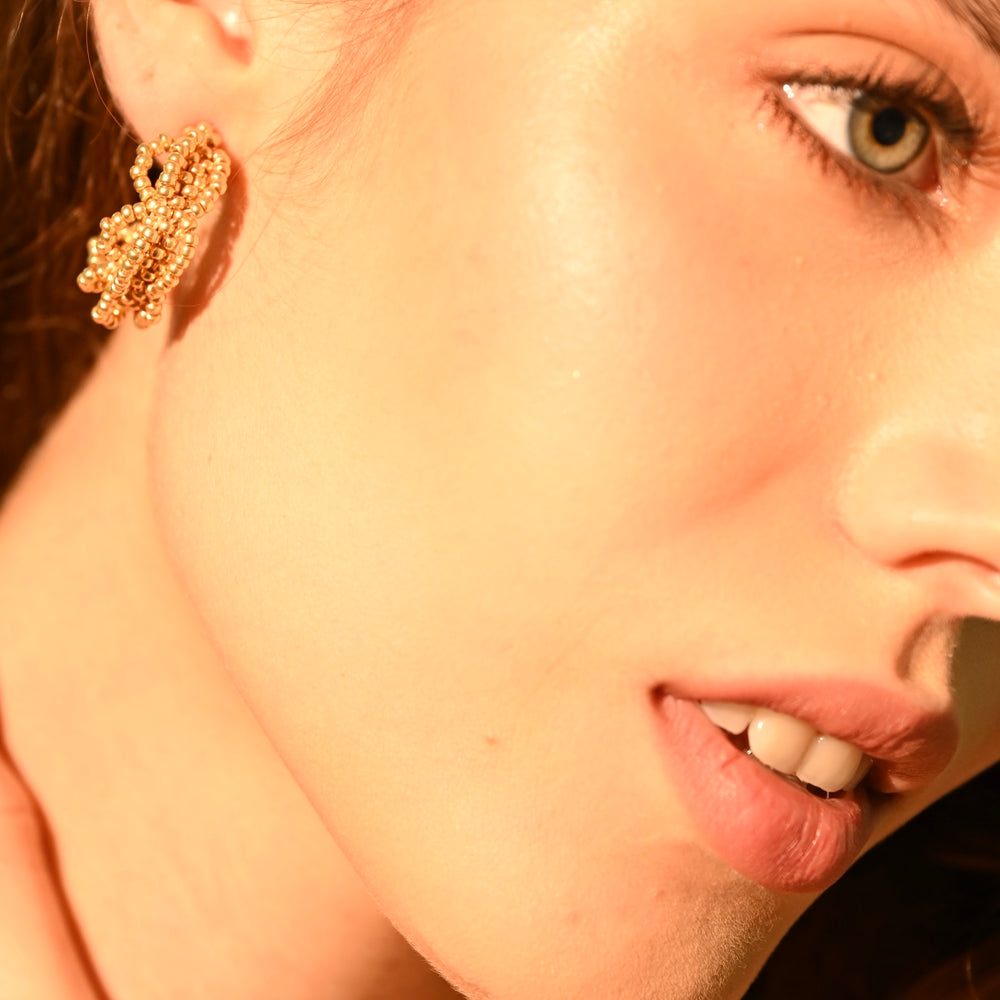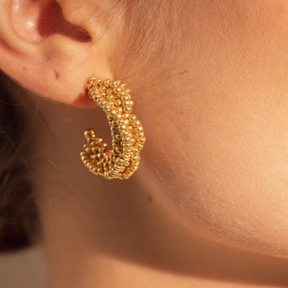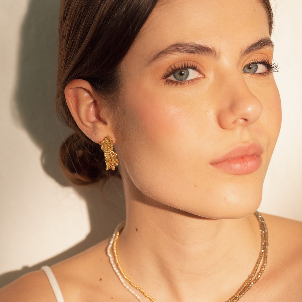 Candongas tejidas a mano con cristales, inspiradas en la belleza orgánica de la naturaleza. Su diseño liviano y texturizado las hace perfectas para un look sofisticado y atemporal.
