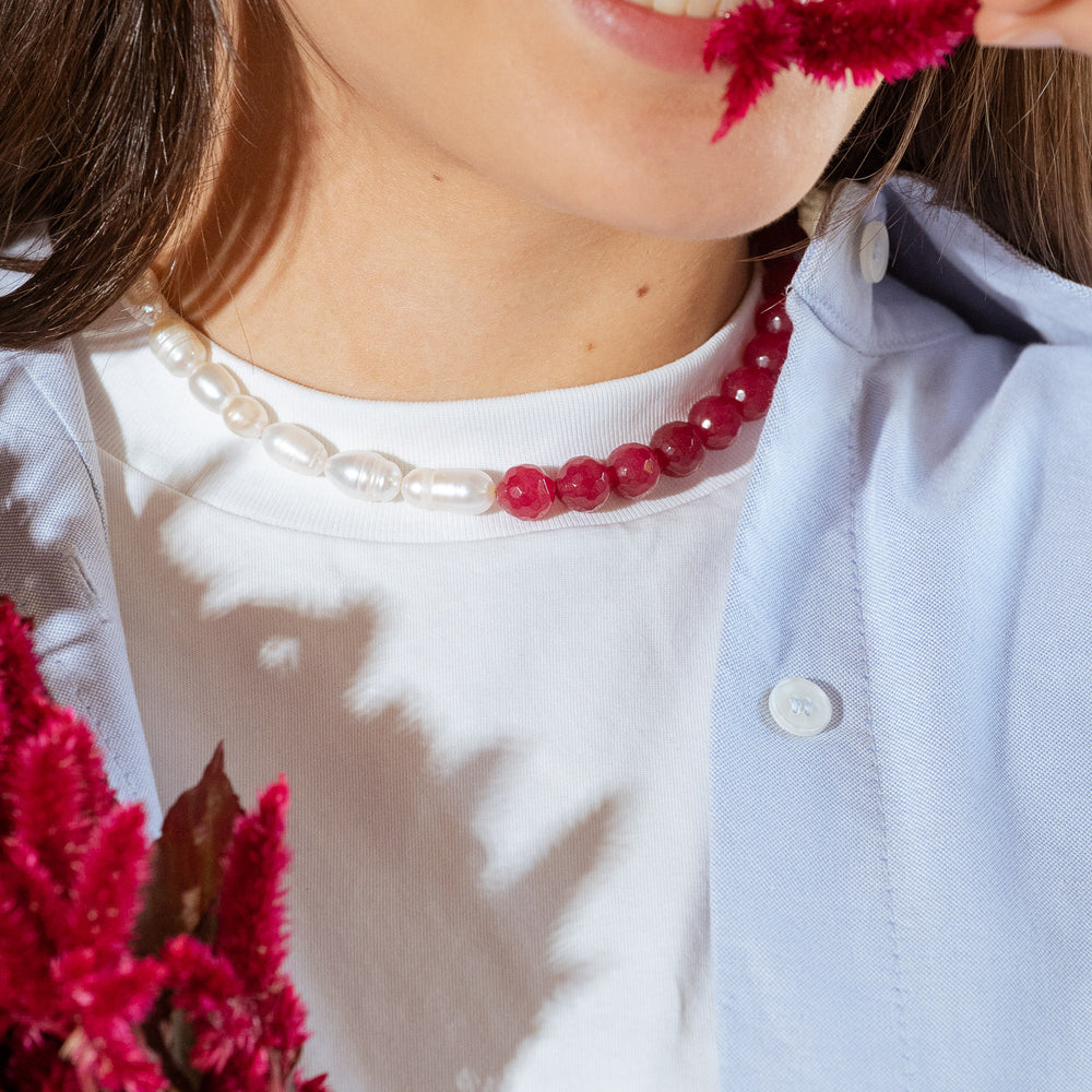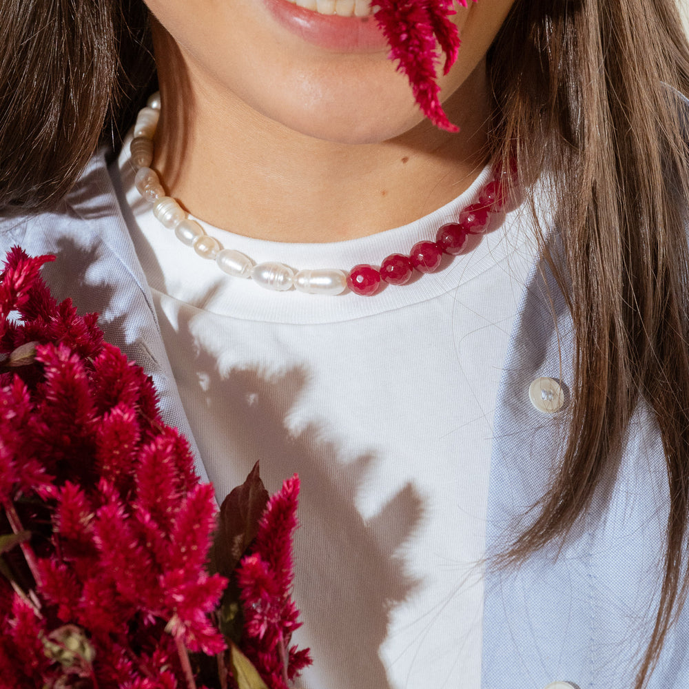 Este collar combina la elegancia atemporal de las perlas naturales con el color vibrante de las ágatas, creando una pieza moderna, fresca y femenina.