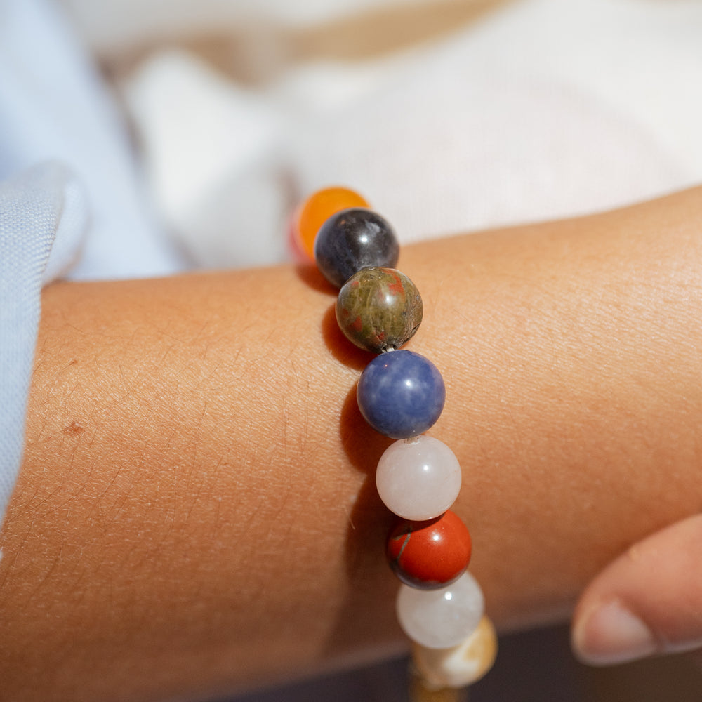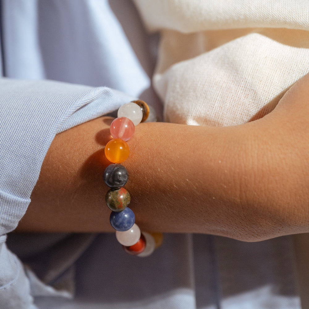 La pulsera Playful Nostalgia es una pieza divertida y llena de color, elaborada con una mezcla única de piedras naturales como ojo de tigre, jaspe dálmata, cuarzo rosado, ónix, ágata, sodalita, aventurina, jaspe rojo, entre otras.